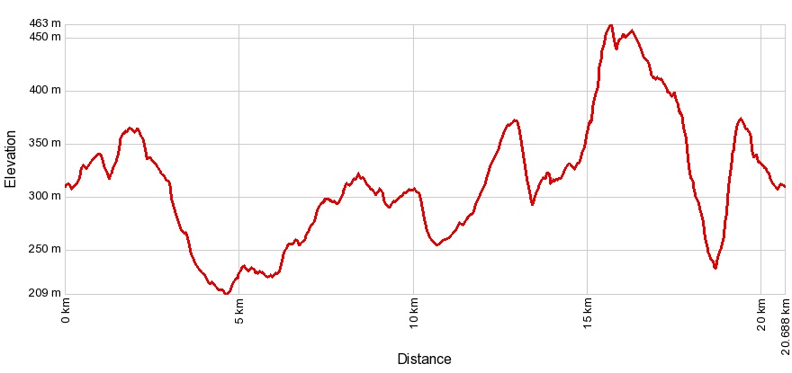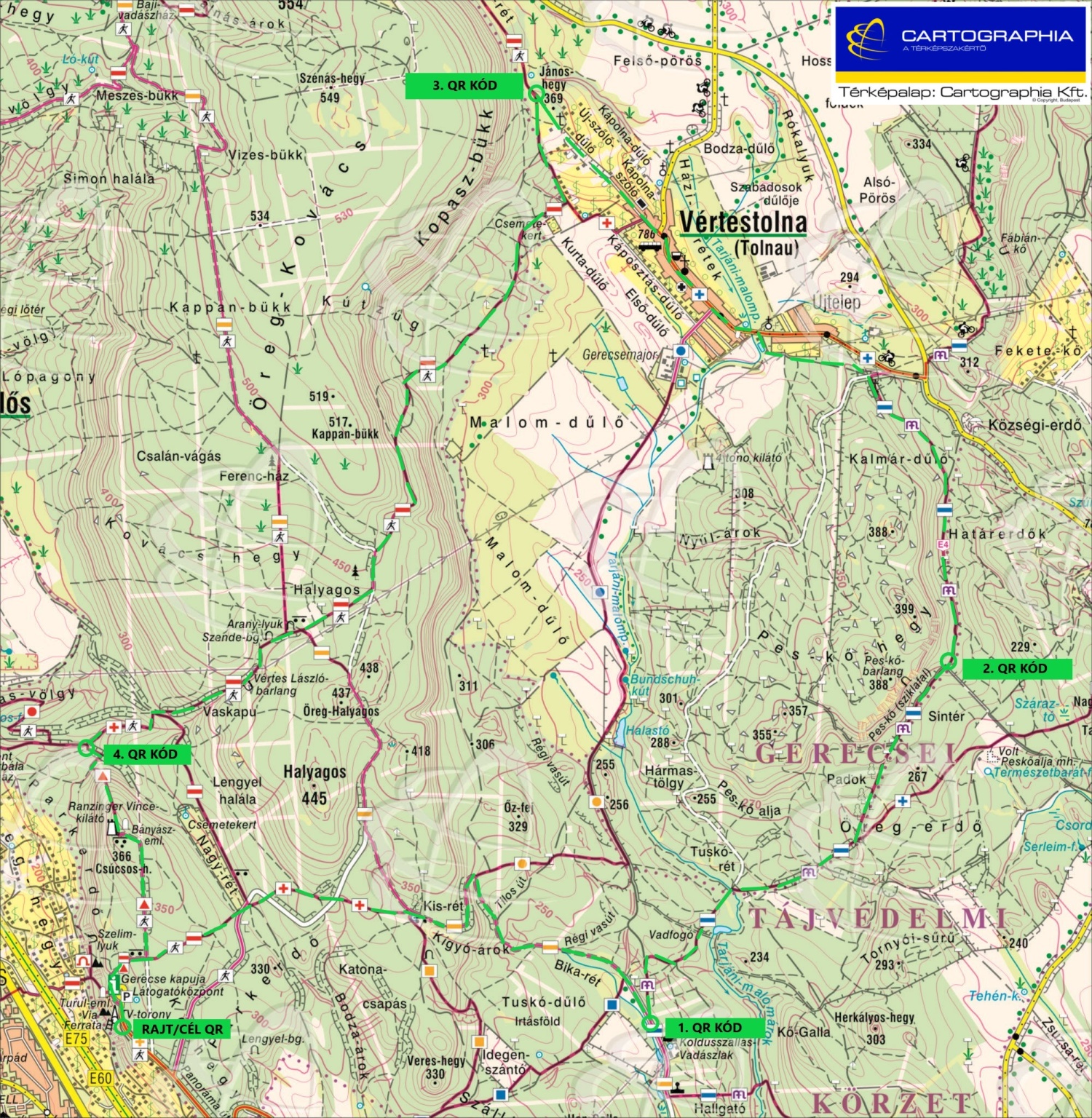 Az El Camino jelzésein egészen Spanyolországig futhatnánk, de most csak Vértestolnán fog keresztülvezetni. A faluban találunk működő nyomós kutat, boltot és egy buszmegállót is, ahonnan óránként indulnak buszok Tatára. Utóbbira azért reméljük, hogy nem lesz gyakran szükség. A civilizációs vívmányok ára a körülbelül 2 kilométernyi aszfalt, ami a terepcipők talpára nem biztos, hogy jó hatással lesz, ezt érdemes számításba venni a felszerelés megválasztásánál. 12,8 km-nél Vértestolnát elhagyva, nem messze a stációk utolsó állomásától egy póznán található a 4. QR-kód (N47.637320 E18.442570), itt kell élesen (visszafelé) balra fordulni a kód leolvasása után a P jelzésre, ami egy rövid lejtő után rövidesen egy viszonylag komoly emelkedővel fogja próbára tenni az állóképességünket. A Kappan-bükk keleti oldalán fél kilométer alatt közel 100 méternyi szintet kell megmászni. A jó hír, hogy ezután már csak egyetlen hasonlóan komoly megpróbáltatásra kell számítani az útvonalon. A piros szakaszon navigáció szempontjából kicsit jobban oda kell figyelni, mivel az Arany-lyuk környékén a S jelzés többször keresztezi a P-t. A lényeg, hogy a tisztásra kiérve a mezőgazdasági terület végig a jobb kezünk felé essen, és kövessük a P jelzést, amit 18.1 km-nél a P+, majd 18,7 km-nél a P▲ jelzés fog váltani. (Az 5. QR-kódot a P▲jelző oszlopon kell keresni: N47.6011770 E18.405580).